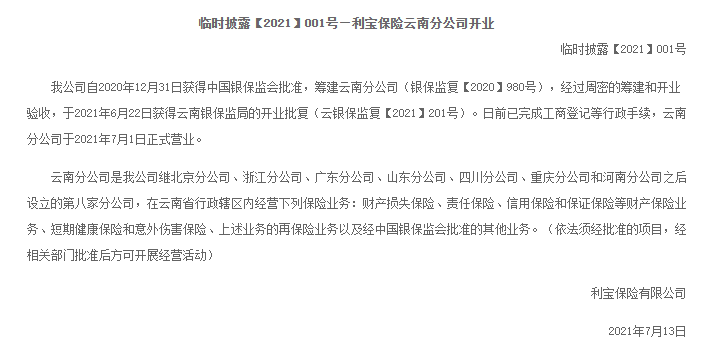 臨時披露【2021】001號—利寶保險云南分公司開業(yè)